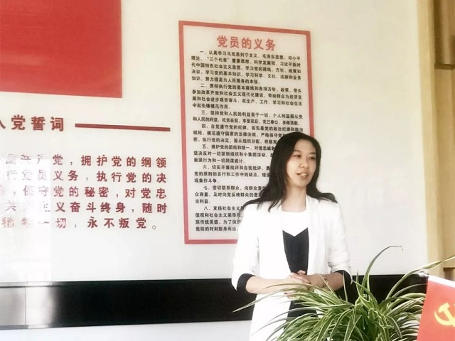 隨后,宋占璐同志代表新黨員在黨旗下做出了莊嚴承諾:將共產黨員的先進性以實際行動體現(xiàn)在自己工作崗位的方方面面,不斷發(fā)揮共產黨員的先鋒模范作用,努力做一個無愧于時代、無愧于黨的好黨員,為爭取明年按期成為一名正式黨員而不懈努力!