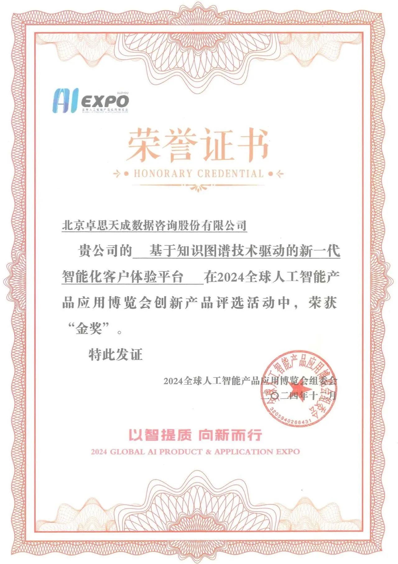 近日,“2024全球人工智能產(chǎn)品應(yīng)用博覽會”(“全球智博會”)于蘇州舉行,會上重磅揭曉了十大產(chǎn)品金獎。張家口產(chǎn)業(yè)投資控股集團(簡稱:張家口產(chǎn)投)被投企業(yè)——國內(nèi)頭部CEM客戶體驗管理平臺北京卓思天成數(shù)據(jù)咨詢股份有限公司(簡稱:卓思)“基于知識圖譜技術(shù)驅(qū)動的新一代智能化客戶體驗平臺”憑借技術(shù)先進性、創(chuàng)新性和應(yīng)用性成功入選,一同上榜的還有華為、煤炭科學(xué)研究總院等企業(yè)及國家級科研機構(gòu)。