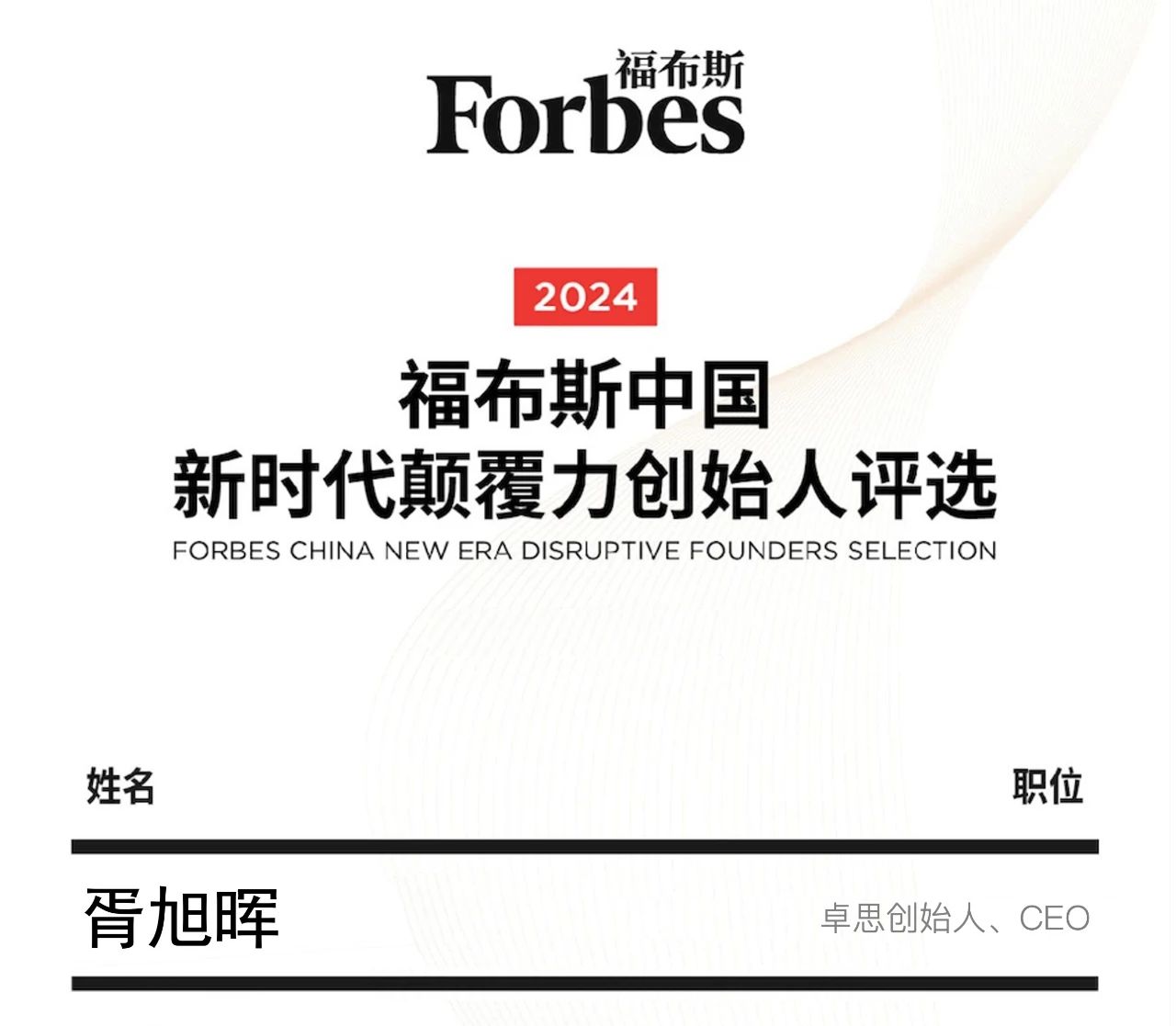 近日,福布斯中國攜手全球化商業(yè)研究院(GBRC)正式發(fā)布“2024福布斯中國新時代顛覆力創(chuàng)始人”評選結(jié)果,北京卓思天成數(shù)據(jù)咨詢股份有限公司(以下簡稱“卓思”)創(chuàng)始人&CEO胥旭暉榮登榜單,一同獲獎的還有360集團(tuán)創(chuàng)始人周鴻祎、科大訊飛創(chuàng)始人劉慶峰、蔚來創(chuàng)始人李斌、獵豹移動董事長傅盛等各行業(yè)領(lǐng)頭羊企業(yè)的創(chuàng)始人。