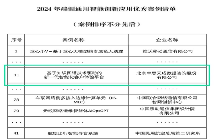 7月1日,中國信通院“2024年端側(cè)通用智能創(chuàng)新應(yīng)用優(yōu)秀案例”名單正式發(fā)布,北京卓思天成數(shù)據(jù)咨詢股份有限公司(以下簡稱“卓思”)“基于知識圖譜技術(shù)驅(qū)動的新一代智能化客戶體驗平臺”憑借技術(shù)先進性、創(chuàng)新性和示范性成功入選,成為CEM行業(yè)唯一上榜品牌。一同上榜的還有中國民航總局、國家新型顯示技術(shù)創(chuàng)新中心、中國移動、金山辦公等央國企、國家級技術(shù)創(chuàng)新中心及頭部科技公司。