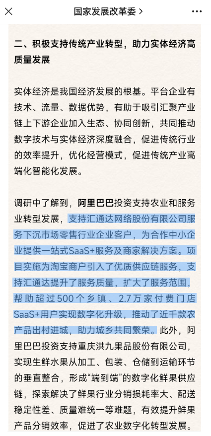 ?2023年7月12日,國家發(fā)展改革委(公眾號:國家發(fā)展改革委)在《平臺企業(yè)在支持科技創(chuàng)新、傳統(tǒng)產(chǎn)業(yè)轉(zhuǎn)型方面形成了一批典型案例》一文中,將匯通達網(wǎng)絡(luò)(09878.HK)作為積極支持傳統(tǒng)產(chǎn)業(yè)轉(zhuǎn)型,助力實體經(jīng)濟高質(zhì)量發(fā)展典型案例提及——“匯通達網(wǎng)絡(luò)股份有限公司服務(wù)下沉市場零售行業(yè)企業(yè)客戶,為合作中小企業(yè)提供一站式SaaS+服務(wù)及商家解決方案?!?/p>