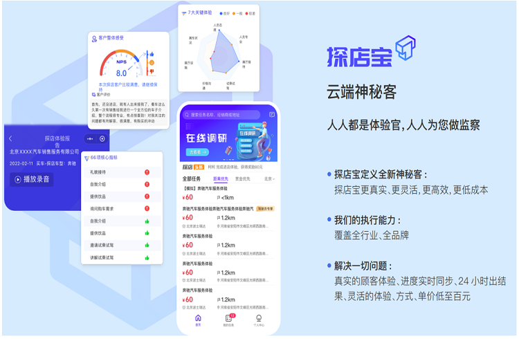 得益于在客戶體驗(yàn)管理與人工智能技術(shù)等方面的不斷投入與創(chuàng)新,卓思迄今已自主研發(fā)超過100個(gè)SaaS、PaaS、APP產(chǎn)品,長期服務(wù)于拜耳、寶馬、奔馳、保利等眾多知名世界500強(qiáng)及頭部標(biāo)桿企業(yè)。其中,探店寶APP作為一款數(shù)字化客戶體驗(yàn)監(jiān)測工具,通過招募體驗(yàn)官執(zhí)行探店任務(wù)的方式還原自然進(jìn)店體驗(yàn),下單后最快24小時(shí)即可查看結(jié)果,能夠有效縮短檢核流程,以全新神秘客模式助力企業(yè)開展輕量管理考核。