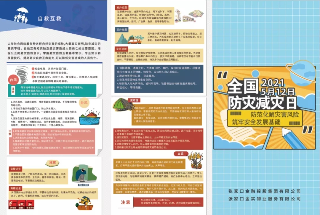 為進一步增強全員避災自救意識,提高企業(yè)員工防災減災能力,張家口金融控股集團旗下張家口金實物業(yè)服務有限公司(以下簡稱”金實物業(yè)”)于2021年5月12日,組織金控大廈企業(yè)安全生產負責人及全體企業(yè)員工參加張家口高新技術產業(yè)開發(fā)區(qū)南站街道長寧街社區(qū)組織的“防范化解災害風險,筑牢安全發(fā)展基礎——防震減災疏散演練活動”,活動中發(fā)放宣傳手冊200余份,20余人參與疏散演練活動,應急管理局、藍天救援隊、社區(qū)衛(wèi)生服務站、長寧街社區(qū)、轄區(qū)居民共同參與。