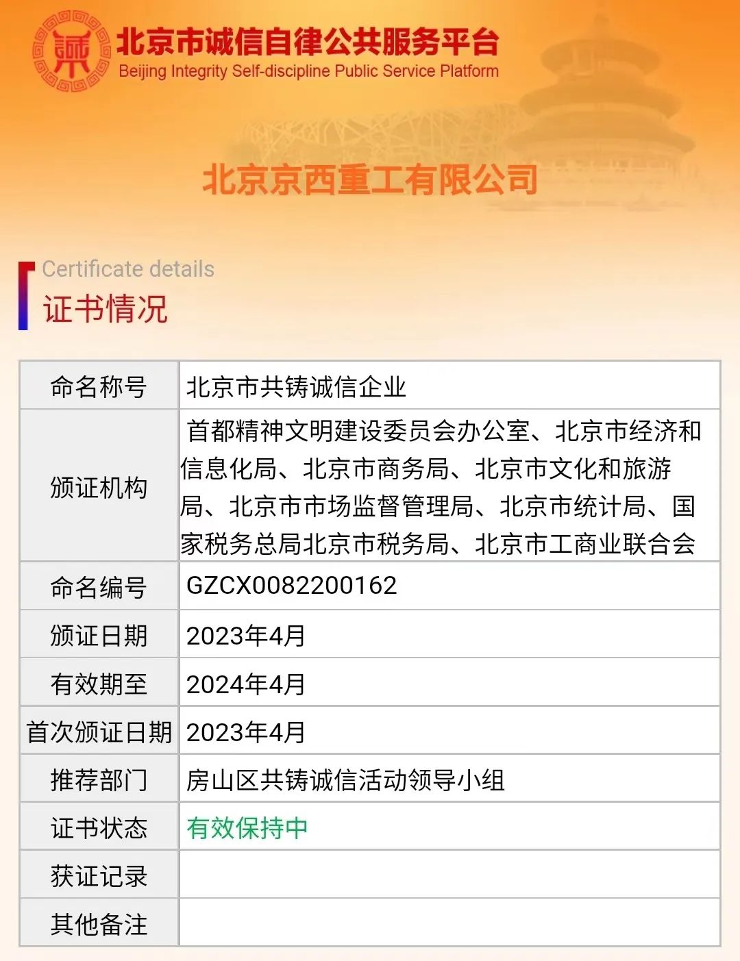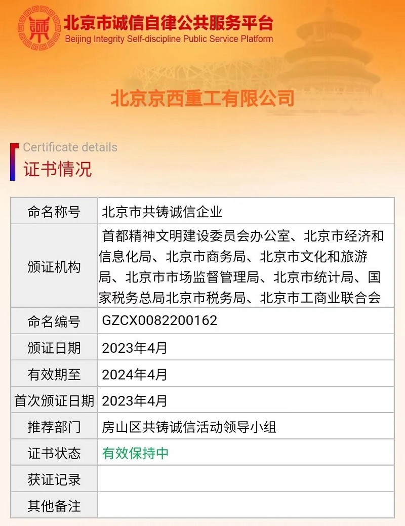 ?此次成功榮獲“北京市共鑄誠信企業(yè)”稱號,是對公司誠信經(jīng)營和良好口碑的高度認(rèn)可。以誠信為本,互信互助,賦能公司高質(zhì)量發(fā)展。接下來,京西重工將繼續(xù)堅持誠信為本原則,不斷完善誠信管理制度,持續(xù)提高企業(yè)的誠信意識和信用管理水平,追求卓越、真誠合作、把關(guān)產(chǎn)品、奉獻(xiàn)社會。