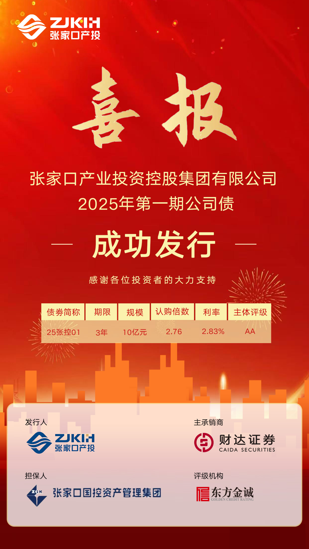 2025年4月17日,張家口產(chǎn)業(yè)投資控股集團(tuán)有限公司(以下簡(jiǎn)稱:張家口產(chǎn)投)2025年面向?qū)I(yè)投資者非公開成功發(fā)行第一期公司債券。本次債券發(fā)行規(guī)模高達(dá)10億元,期限為3年,票面利率2.83%,全場(chǎng)認(rèn)購(gòu)倍數(shù)超過2.76倍,一舉創(chuàng)下張家口公司債及同期限債券票面利率的歷史新低。此次發(fā)行憑借較低的票面利率和較高的認(rèn)購(gòu)倍數(shù),凸顯了資本市場(chǎng)對(duì)張家口產(chǎn)投綜合實(shí)力與發(fā)展前景的深度認(rèn)可。